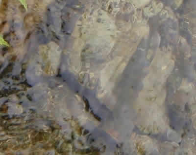 川上橋の下にいつもいるヤマメ。 30cmくらいあるでかいやつです。 上からみると、波の陰影や小石の模様に隠れて見つけるのが難しいです。 写真でもよく分かりませんね。 ヤマメの模様ってやつはよくできてます。 (実はこのレポートはだいぶ後になってから書いてるので、「あれ?どれがヤマメだったかな?」と怪しくなってしまってます。 たぶん、中央やや右で縦に泳いでるのがそうだと思うんですが)